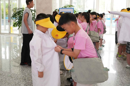 “這是給你的新書包,里面文具也配齊啦!”康華眼鏡的“小工匠”們率先邁步,把印有工會LOGO的定制書包遞到“醫(yī)院娃”懷里。回禮隨即登場——“醫(yī)二代”雙手捧起迷你白大褂,為結(jié)對伙伴現(xiàn)場披上。46件雪白戰(zhàn)袍瞬間“上線”,孩子們踮起腳尖、互相整理衣領(lǐng),儀式感在這一刻被拉得滿滿當當。