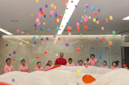 全國五一勞動獎章獲得者葉海輝一亮相,便以一句“口香糖,粘哪里?”點燃全場——孩子們像被施了魔法般飛奔、貼肩、抱團,笑聲此起彼伏;緊接著,巨幅降落傘“嘭”地撐開,彩綢如云朵騰空,孩子們“嗖”地鉆進傘下,仿佛小兔子躲進巨型蘑菇避雨。大家圍成一圈,齊心抖動傘面,五彩海洋球頓時化作翻涌浪花,門診大廳瞬間變成歡樂的海洋。