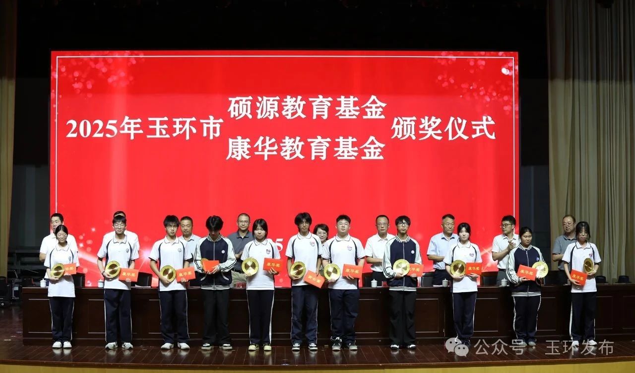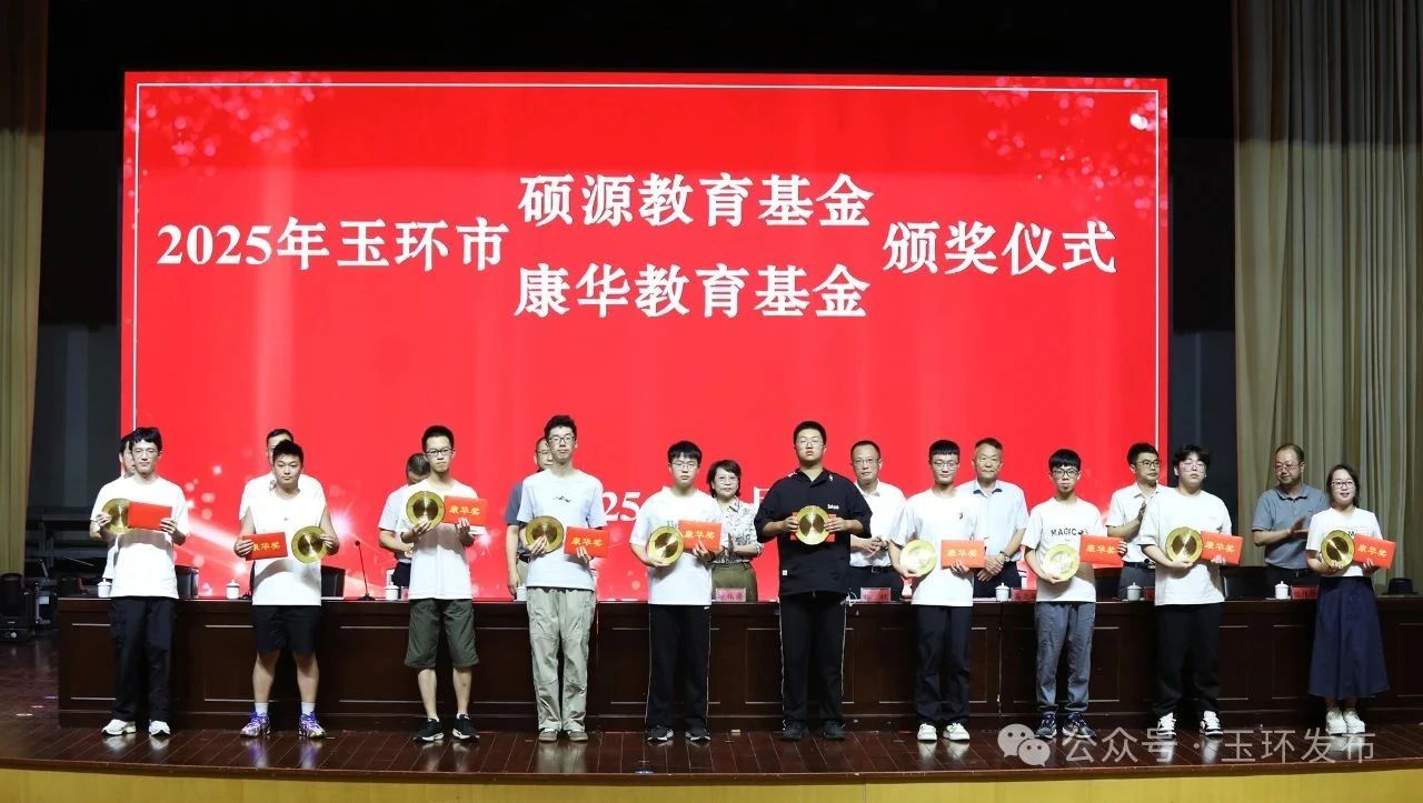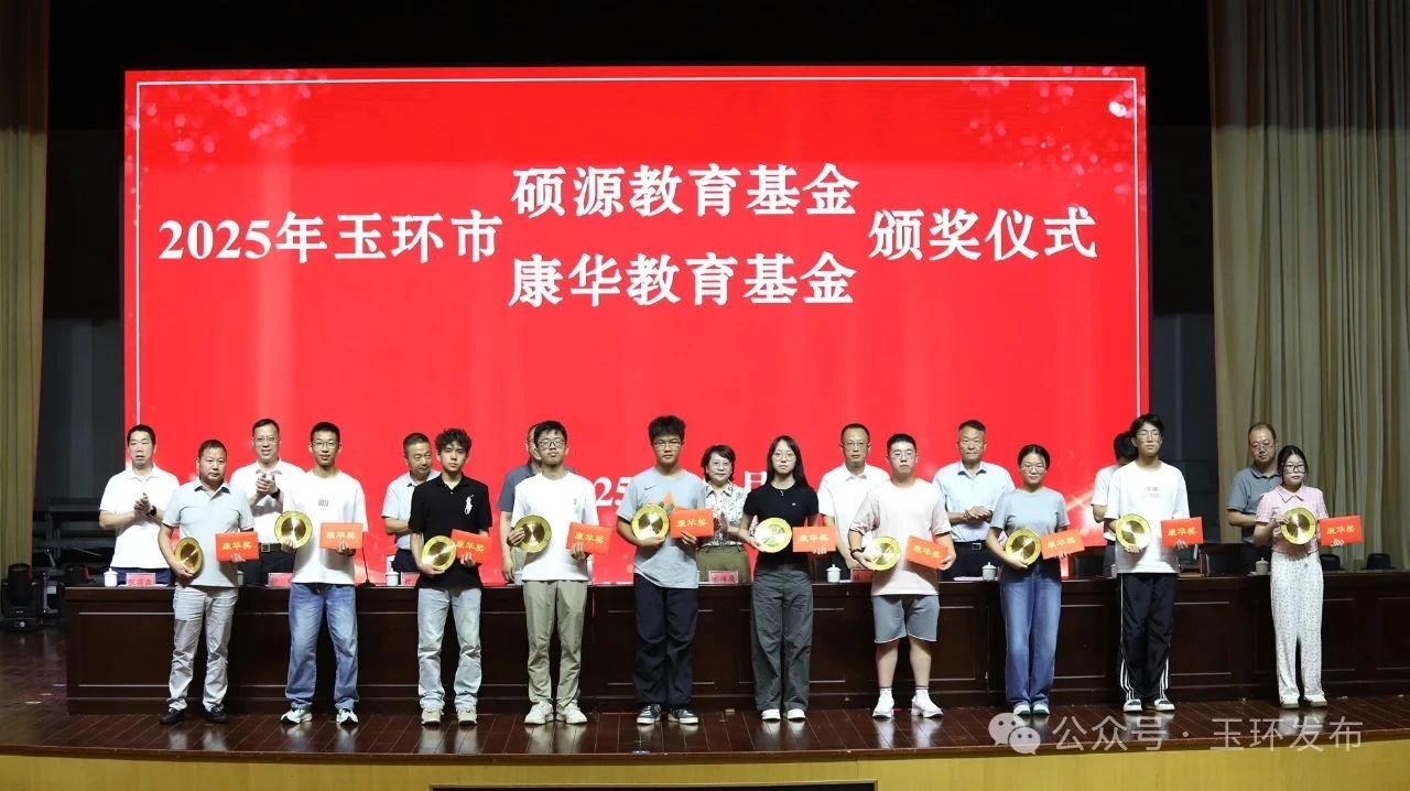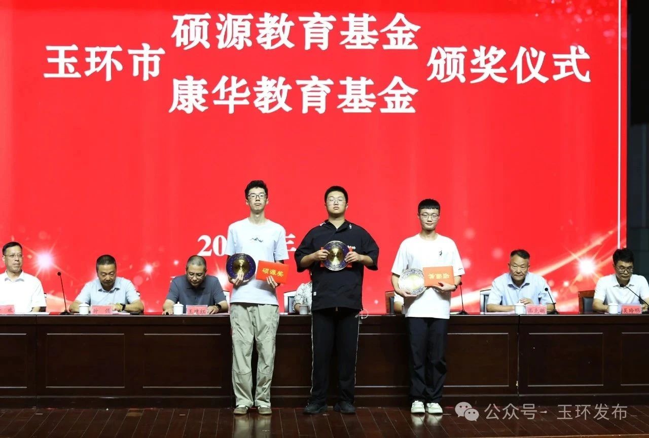 與會(huì)領(lǐng)導(dǎo)和嘉賓向2025年玉環(huán)高考優(yōu)秀學(xué)生代表表示祝賀,并向考上清華大學(xué)的魯洪軒、陳宣鋆、吳昊三位同學(xué)頒發(fā)浙江碩源教育基金會(huì)“英才獎(jiǎng)”。